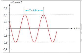 La courbe représente les variations de la vitesse $v(t)=V_{m}\sin\left(\dfrac{2}{T}t+\Phi_{y}\right)$ d'un point mobile en mouvement rectiligne sinusoïdal