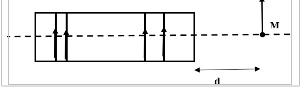 4.1. Maintenant en tenant compte du champ magnétique terrestre horizontal orthogonal à l'axe de la bobine comportant $1600$ spires par mètre de longueur et parcourue par un courant d'intensité $I=10\,mA$, placée à une distance d d'un point $M$ (voir figure ci-dessous)