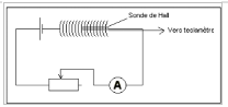 On dispose du montage suivant : A l'aide d'une sonde à effet Hall et d'un teslamètre, on mesure le champ magnétique à l'intérieur du solénoïde en fonction de l'intensité.
