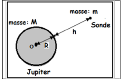 $\begin{array}{|c|c|c|} \hline \text{Position de la sonde }&M_{1}&M_{2}\\ \hline \text{Altitude }&h_{1}=278\cdot 10^{3}\,km&h_{2}=650\cdot 10^{3}km\\ \hline \text{Intensité de pesanteur }&g_{1}=1.04 N\cdot kg^{-1}&g_{2}=0.243 N\cdot kg^{-1}\\ \hline \end{array}$