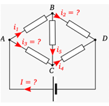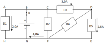 Déterminer le sens et l'intensité des courants dans les branches $AC$, $BD$ et $AGD$ de la figure sachant que