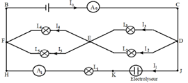 schématisé sur la figure et placé en série avec un électrolyseur dont les électrodes sont liées aux points $J$ et $K$ et qui contient une solution électrolytique de chlorure de fer $III$ :