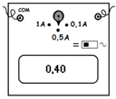1. L'ampèremètre $(A)$ possède $100$ divisions, il est utilisé sur le calibre $10A$, l'aiguille s'arrête en face de la division $40$ et indique l'intensité $I$
