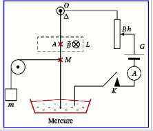 Un fil conducteur en cuivre rigide et homogène de masse $m$, de longueur $OA=25\,cm$, est suspendu par son extrémité supérieure à un point $0$ autour duquel il peut tourner librement ; sa partie inférieure plonge dans une cuvette de mercure.
