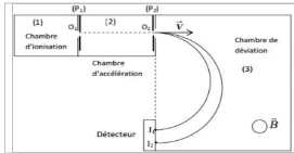 Ces ions sont accélérés entre deux plaques métalliques parallèles $P1$ et $P2 $puis soumis à l'action du champ magnétique qui permet de les séparer.