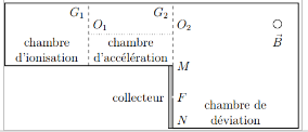 On négligera le poids des ions devant la force électromagnétique et on admettra qu'à la sortie de la chambre d'accélération, les vitesses des ions sont contenues dans le plan de la figure.