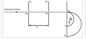 Les ions traversent la plaque $P_{1}$ en $O_{1}$ sans vitesse initiale.