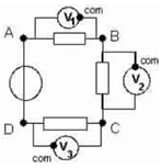 3. Les valeurs mesurées sont : voltmètre $V_{1}\ :\ 2.5\,V$ voltmètre $V_{2}\ :\ -3.1\,V$ voltmètre $V_{3}\ :\ 6.4\,V$