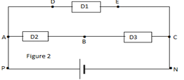 1. Représenter, par une flèche sur le circuit les tensions suivantes : $U_{DE}$ ; $U_{CB}$ et $U_{CN}$